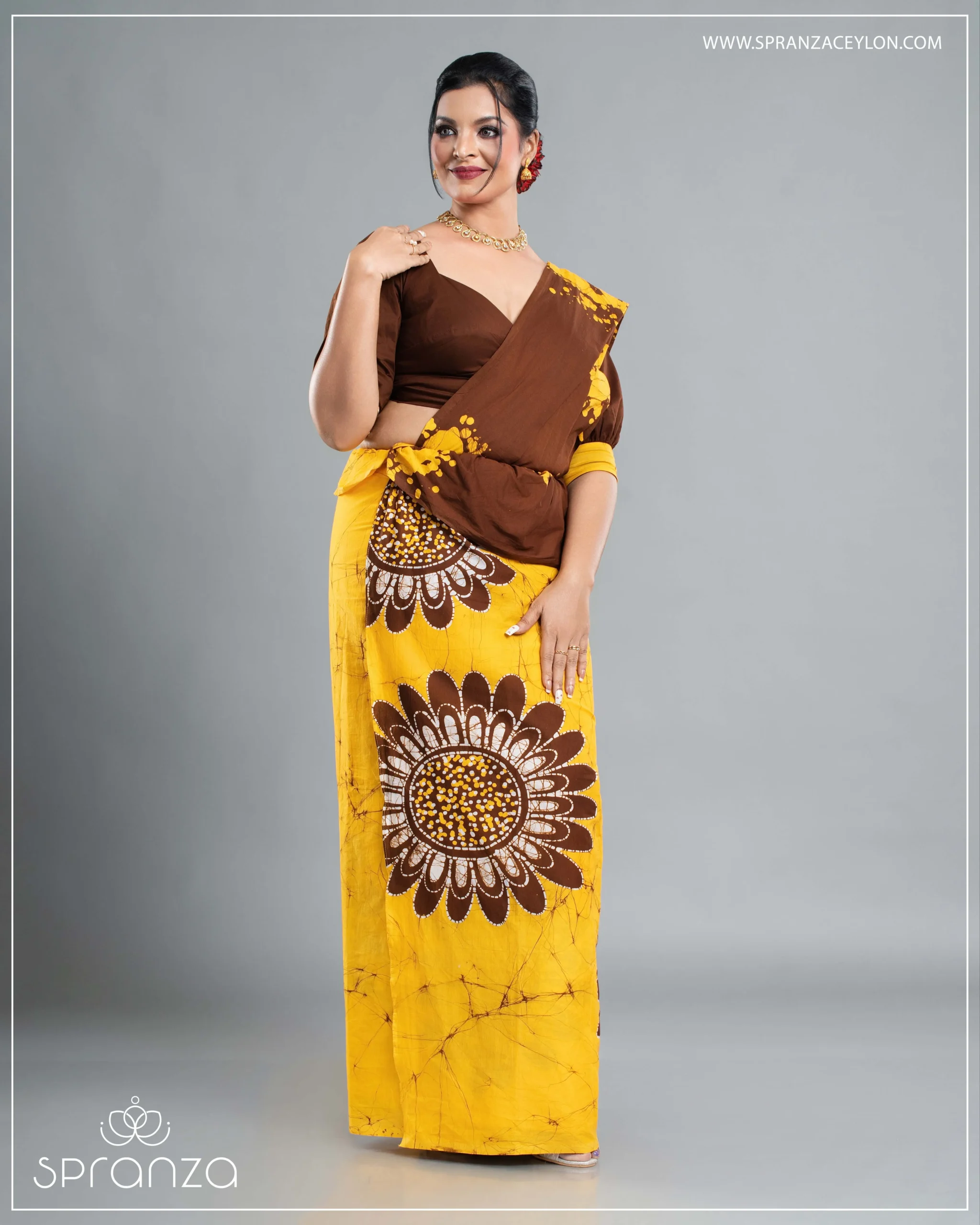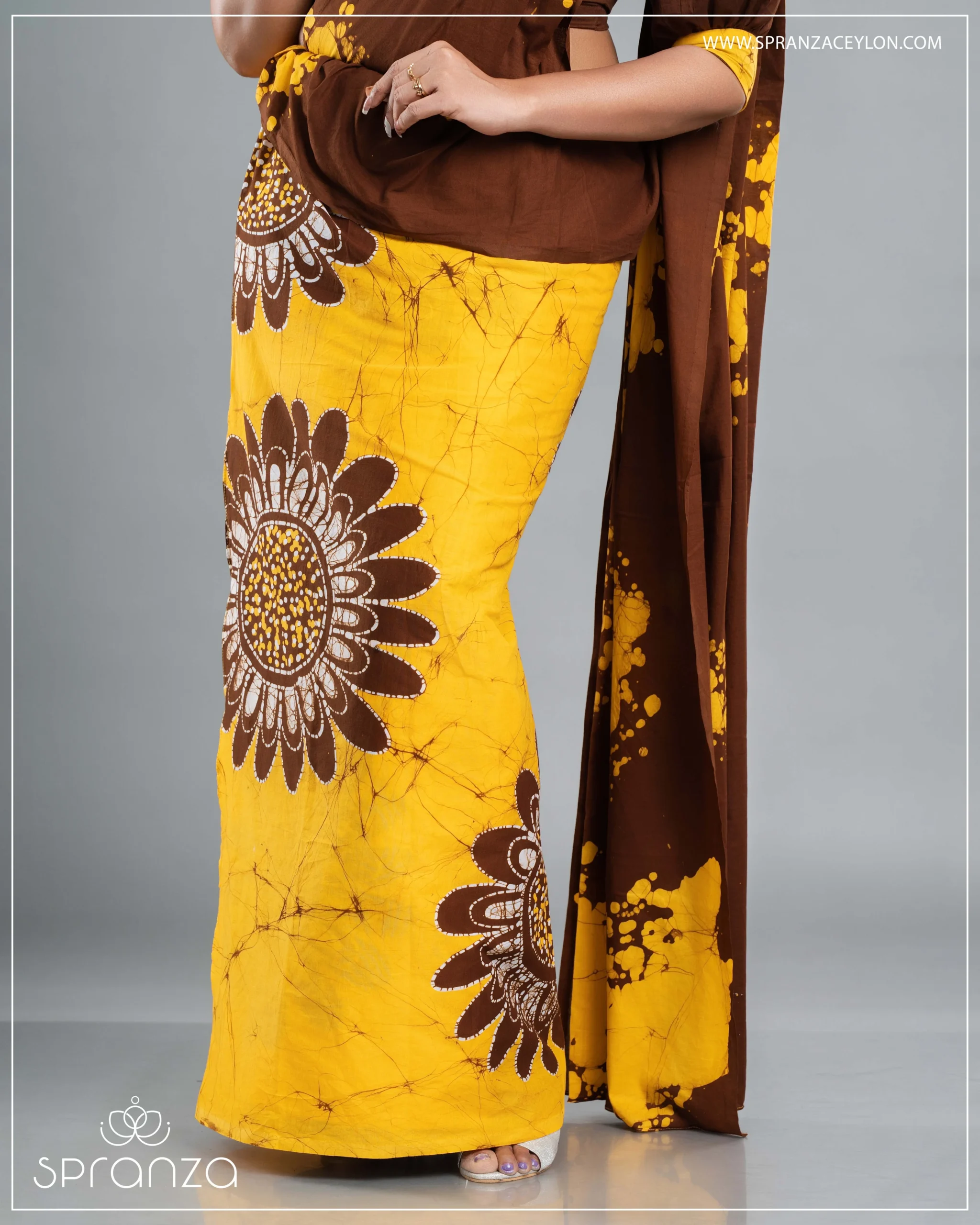 This saree features a warm blend of yellow and brown batik patterns, crafted with beautiful detailing and a touch of modern fashion. Perfect for office wear, festive events, school functions, and special days. Style it with matching accessories and light-toned heels for a bright and graceful look. Add this radiant saree to your wardrobe — its vibrant colours and unique handcrafted design make it a truly rare piece.